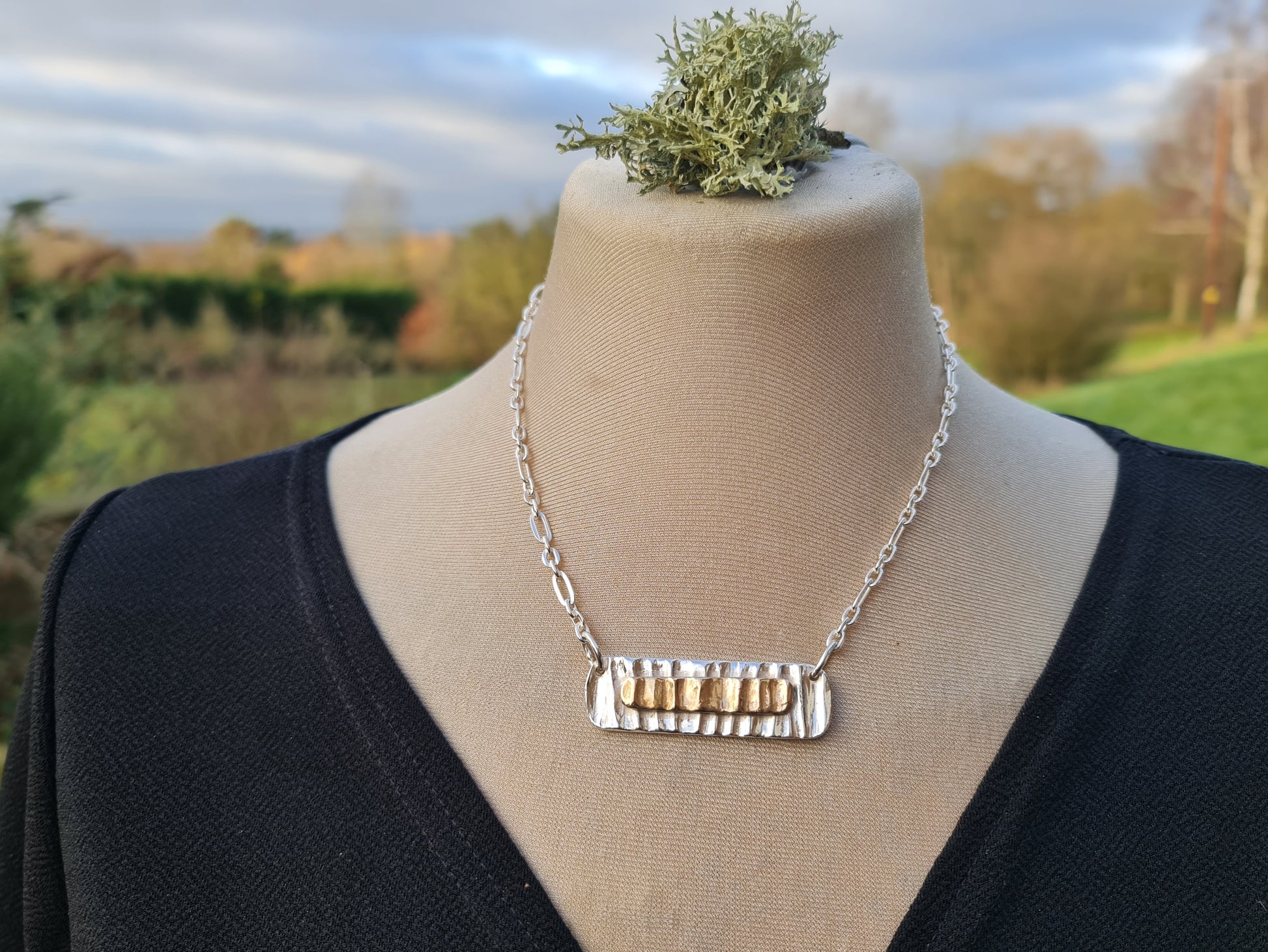Designed to be different. This beautiful, statement, necklace has a real impact and can be worn and treasured for years and years as it's simplicity will never go out of fashion. The necklace is made from solid sterling silver with a bronze accent. The texture has been carved in wax to recreate patterns found in nature and then cast in precious metals.